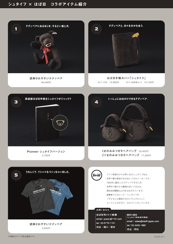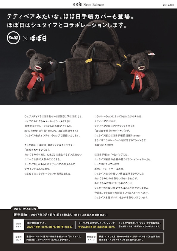 「ほぼ日」のオリジナルキャラクター「誤解されやすいくま」のシュタイフ製テディベアバージョンを始め、日本で最も売れている ほぼ日手帳のカバー、手帳本体、バッグ(大・小2種)、記念Tシャツを、2017年9月1日より販売します。