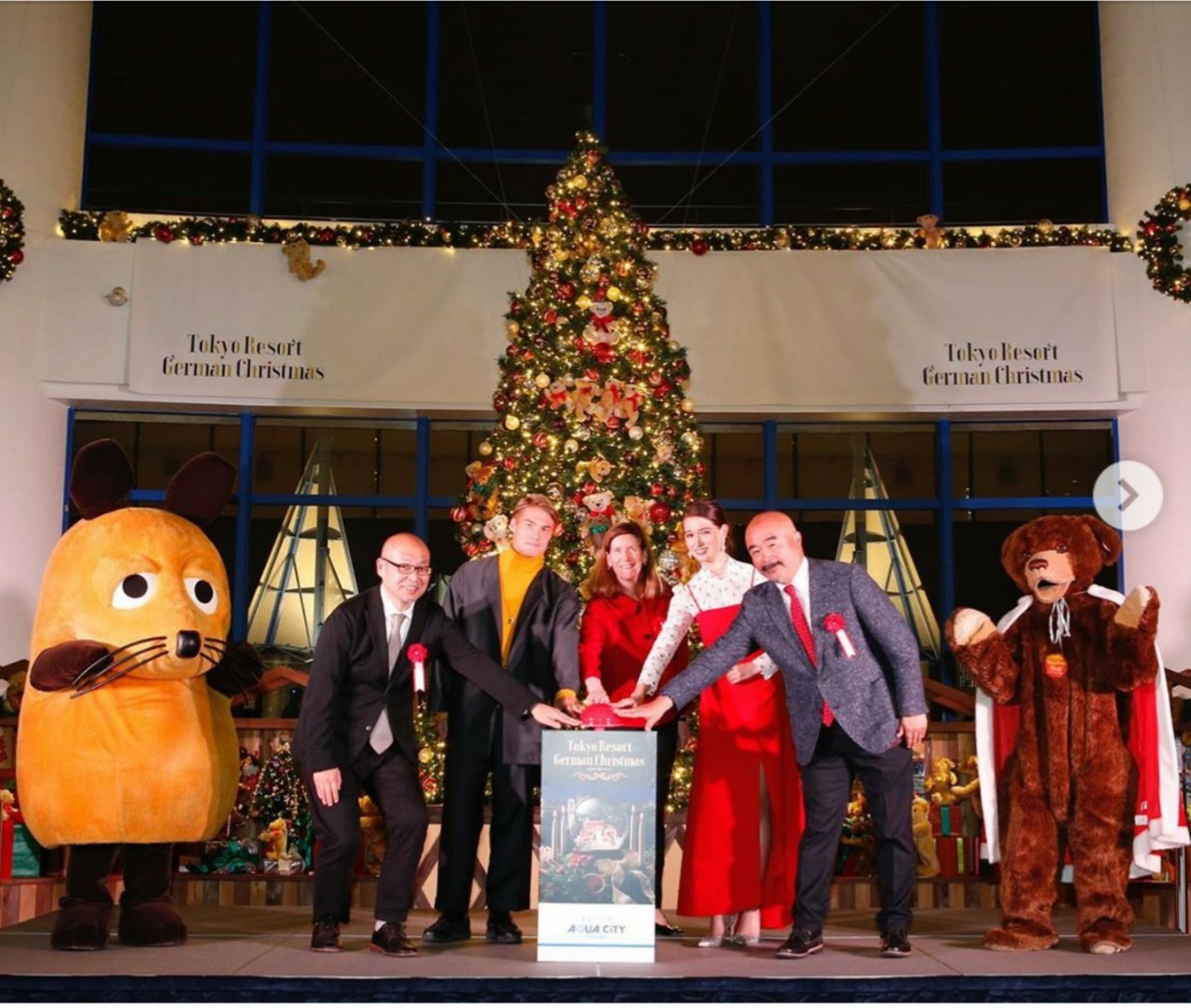 オープニングイベントとして、100体のテディベア達がそれぞれの物語を紡ぎ5000個の電球が光輝くクリマスツリーの点灯式が行われ、ドイツ大使館関係者、日本代表サッカー選手、女性誌モデル達が参加し一足早いクリスマスの始まりを祝いました。(右端佐藤財団理事長)