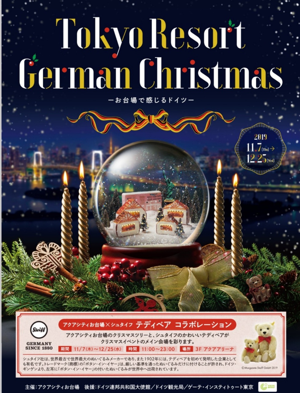 11月7日よりお台場アクアシティにて「TOKYO RESORT GERMAN CHRISTMAS」が開催しました。当財団は、メイン展示のシュタイフテディベアクリスマスツリーの展示協力をしました。