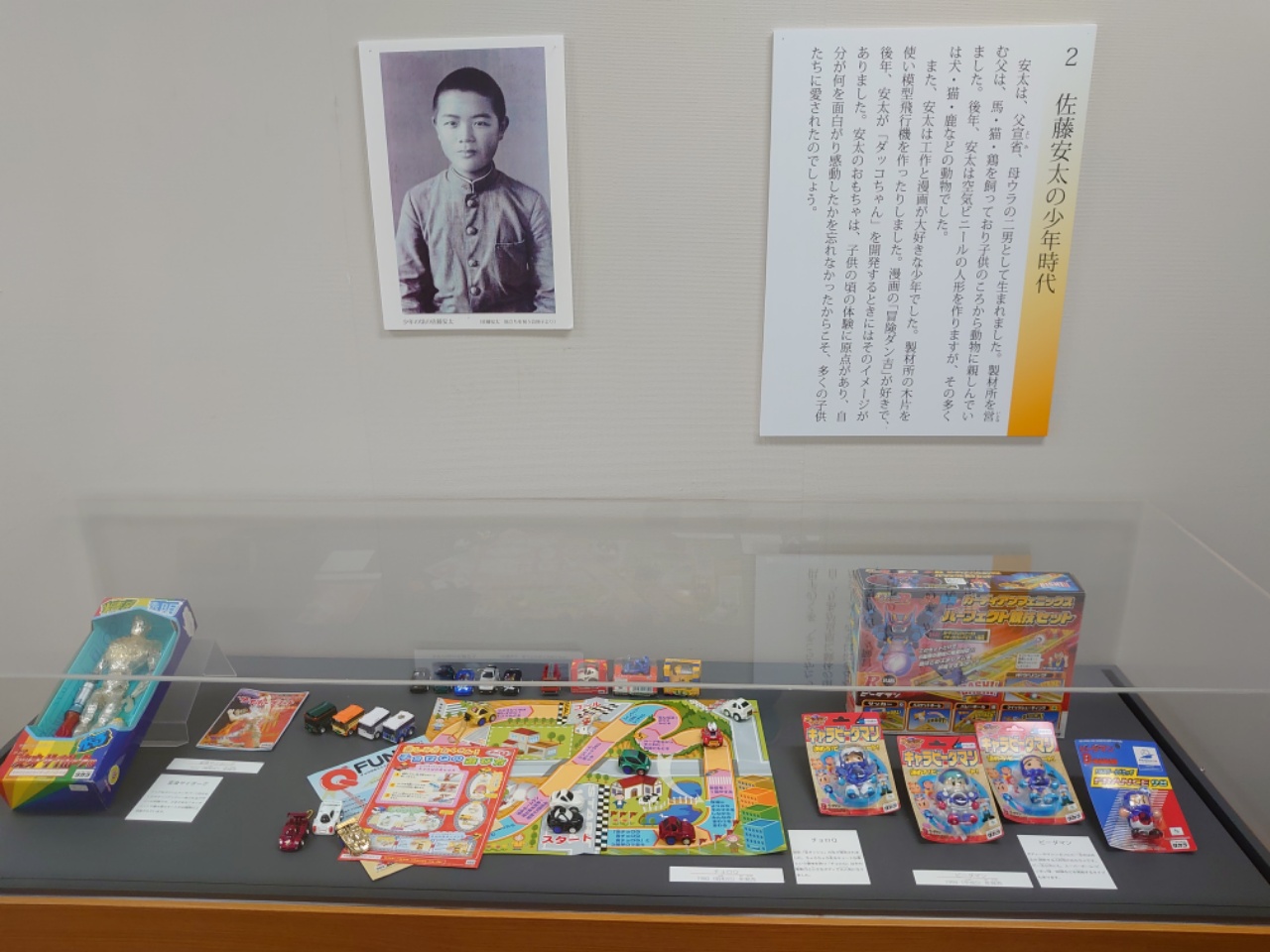 2020年7月18日㈯より9月15日㈫まで、いわき市勿来関文学歴史館にて、「佐藤安太展」~いわきの生んだおもちゃ王~ が開催しています。佐藤安太の足跡を巡る貴重な資料や、昔、遊んだおもちゃを眺めて楽しめる展示をしております。開催期間が残りわずかですが、厳しい時代にも明るく夢を持って生きた佐藤安太の姿を巡ることで、訪れた方々に元気が届くことを願います。