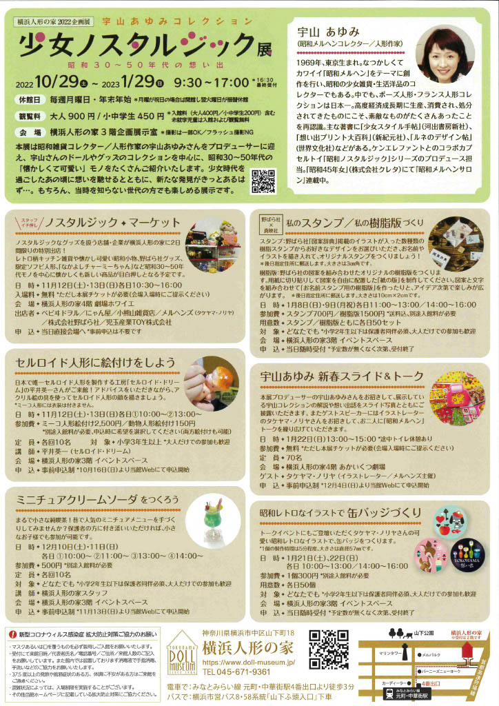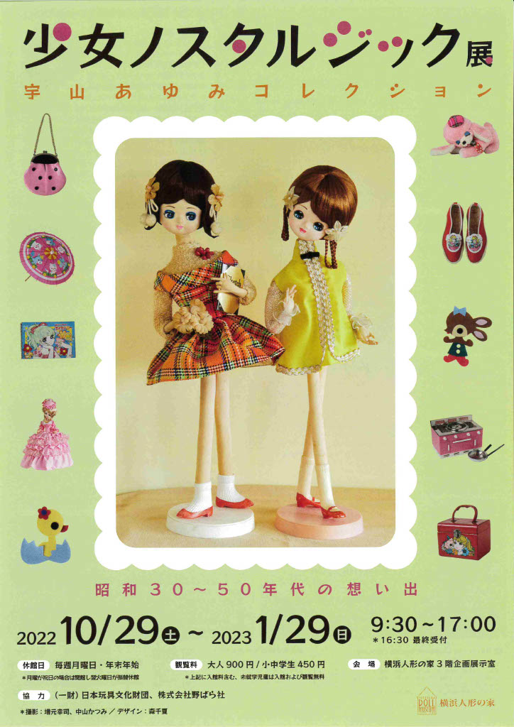 昭和雑貨コレクター/人形作家の宇山あゆみさんのドールやグッズのコレクションを中心に、昭和30から50年代の「懐かしくて可愛い」モノをたくさん紹介されています。財団としてもお人形やお弁当箱・ポーズ人形などお貸出ししいたしました。